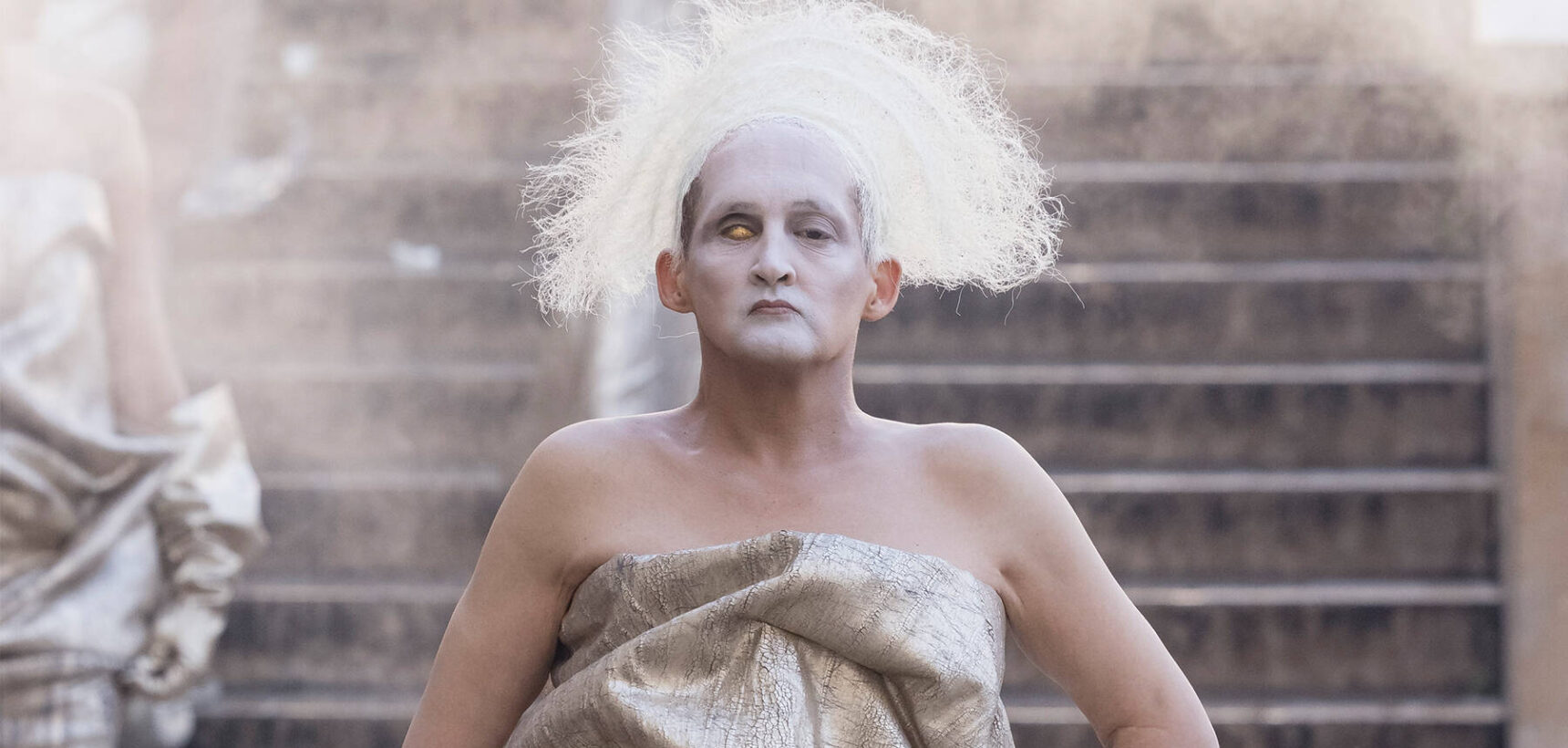 Rather than a model parade, he used friends whom he admires “for living their aesthetic so completely and generously”, such as Hannah Dalton of Fecal Matter, the photographer Kristina Nagel and Allanah Starr, a grand dame of the Paris and New York trans community. They walked alongside fashion students and members of the Owenscorp team descending the steps of the imposing venue, not as individuals, but in tribal groups, each wearing the same kinds of garments: some in deconstructed biker jackets, some in flowing robes, others in slashed and layered knits or fishtail gowns. They looked heroic, noble, important – like diplomatic delegations from the different territories of Owens’ gloriously gothic imagination. In his habitual full-caps typeface, the designer described his casting and groupings as: “AN EXPRESSION OF UNITY AND RELIANCE ON ONE ANOTHER.”