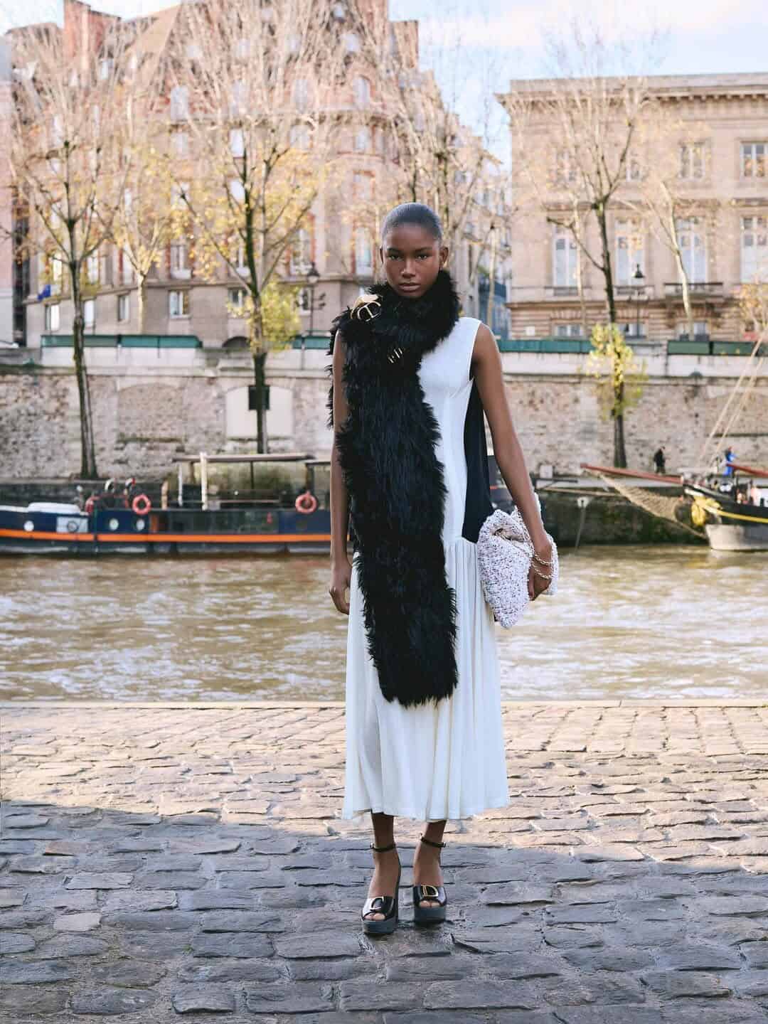 The occasion wear draws on similar themes established by Anderson in his debut, this time adjusting for the winter season. Slinky black gowns with oversized bows that sprout from the hips offer a more minimal option, whilst statement pieces, like a white faux fur-timmed coat with a train emblazoned by flowers and a blue party number with tulle details, are impossible to ignore.