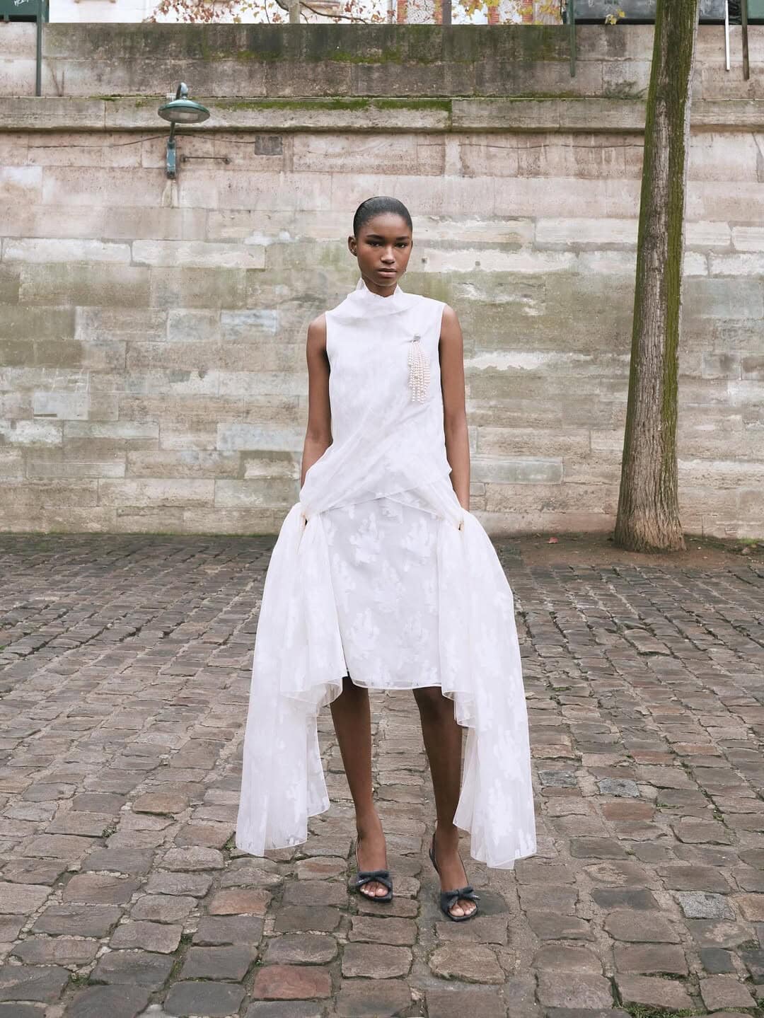 Cascading swathes of silk printed with delicate flora form dresses that have been pinned and gathered to create effortlessly graceful silhouettes. Rich with Dior references, much like his debut, the Bar jacket has inspired long-line, minimalist coats as well as shrunken versions that are threaded with loose bow-tied ribbons. A connoisseur of playing with proportions, oversized slacks and jeans, with triple the amount of fabric required, are paired with simple suede jackets and bouclé cardigans.
