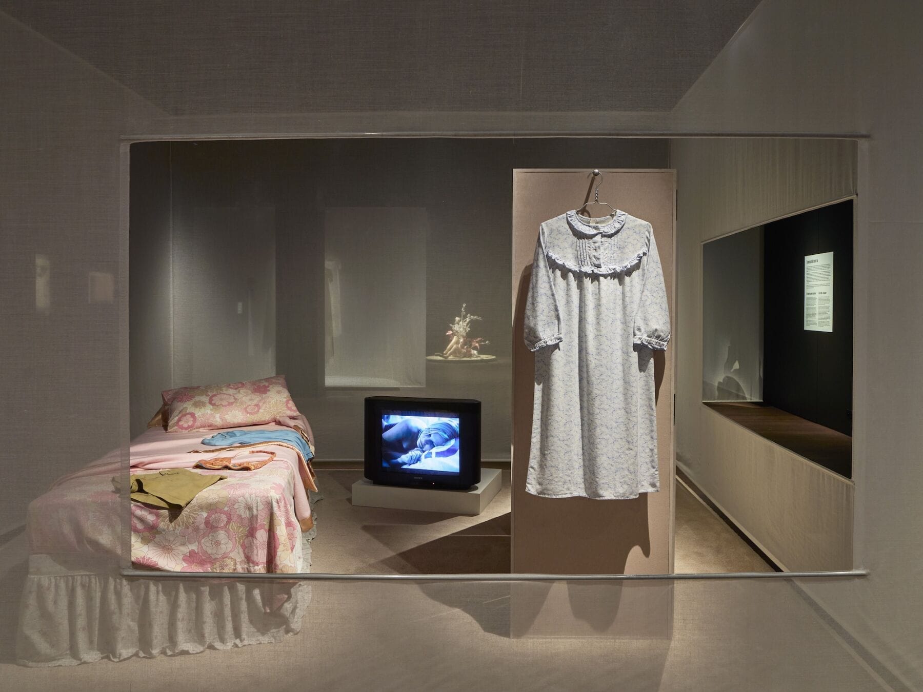 Journeying through the exhibition, the curation leans into more contemporary representations of girlhood, with a focus on the fight for identity and empowerment — a battle often fought both within oneself and against the wider world during the surge towards adulthood. The teenage bedroom is a laboratory for experiments in self-conceptualisation and realisation, and Girls. On boredom, rebellion, and being in-between encapsulates this with precision, through three central bedroom installations. Reminding us of the vulnerability of teens, Coppola’s 1999 film The Virgin Suicides is a seminal commentary on girlhood. Original costumes from the production are displayed in the first bedroom installation, alongside a nostalgically dressed single bed and a vintage television playing clips from the film.